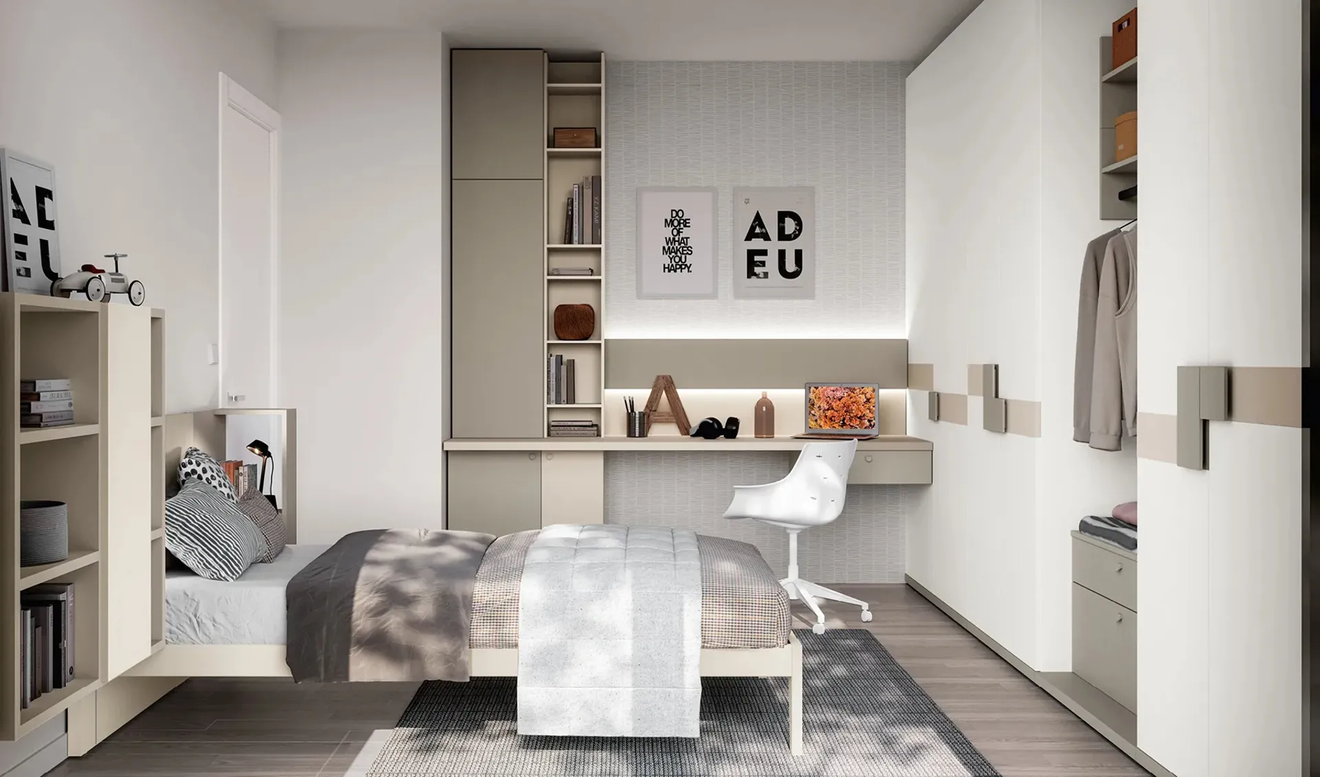 Doimo Cityline mette a disposizione una ricca gamma di accessori da accostare su misura: troverai letto, armadio o cabina armadio, scrivania, sedie e librerie. Questa proposta in laccato opaco ultima perfettamente le doti di funzionalità e il valore estetico della camaretta, poiché è capace di unire funzionalità ed ergonomia. Se cerchi idee creative per arredare perfettamente la stanza dei tuoi bambini, ti presentiamo la Cameretta Layout 02A di Doimo Cityline con finitura in laccato opaco. Nella progettazione della stanza dei giovani affidati a noi: nel nostro showroom presentiamo tutte le più belle composizioni arredative moderne per la loro camera.